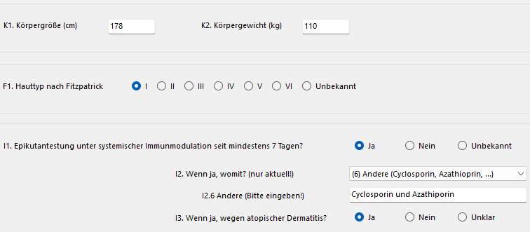 Zusätzliche Anamnese im Rahmen von DKG oder IVDK Studien hinsichtlich epikutan getesteter Fälle können hier aktiviert werden. Ab Mitte 2022 (Version 2.0 R19) werden die bisherigen Fragen zum Zigarettenkonsum durch Fragen zum Körpergewicht und Körpergröße ersetzt. Ab Mitte 2023 (Version 2.0 R21) wurden Fragen bzgl. Epikutantestung unter systemischer Immunmodulation hinzugefügt, ab 2026 der Hauttyp nach Fitzpatrick.