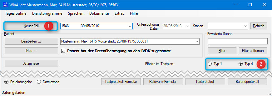 Bei der Wiedervorstellung eines bekannten Patienten wird ein weiterer neuer Fall angelegt, siehe hierzu auch Patient. Bitte ordnen Sie nach der Anlage eines neuen Falles (1) unbedingt Typ (2) zu: entweder Typ 4 (i.e. Spättyp-Allergie, Standard) oder Typ 1 mit eingeschränkten Anamnese- und Befundfeldern