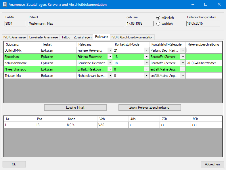 •Für jede dieser Testsubstanzen soll festgestellt werden, welche Bedeutung diese Reaktion für die derzeitige Hauterkrankung hat. (Ein Überspringen dieser Eingabe ist nicht möglich.)