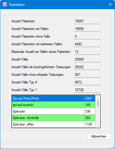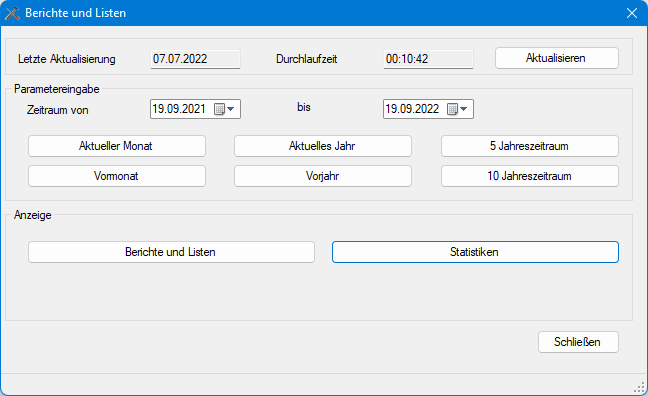 Die bisherigen Berichte und Listen aus dem WinAlldat IVDK Programm "Datenübertragung, DKG Update, Statistiken" wurden verbessert (z.B. sind nun auch patienteneigene Testsubstanzen [PeS] in der Berichtsdatenbank verfügbar) und in das WinAlldat Net Programm integriert worden. Um die erfassten Daten für eine Listen- Berichtsansicht aufzubereiten, müssen die Daten in einer speziellen Datenbank "winalldatnetrep" (SQLite db3, MS SQL Server) zuerst aufbereitet und in eine neue Metastruktur zusammengeführt werden. Um die Berichtsdatenbank neu zu erzeugen oder zu aktualisieren, betätigen Sie bitte den Button "Aktualisieren" oben rechts im Dialog "Berichte und Listen" (s. Screenshot). Es wird empfohlen die Berichts- und Listendatenbank monatlich zu aktualisieren.