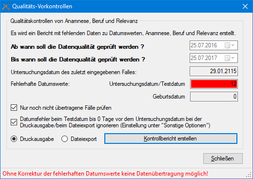 Diese Funktion exportiert in einem 1. Schritt - in pseudonymisierter und verschlüsselter Form - 3 Dateien zur statistisch-epidemiologischen Auswertung auf ihren lokalen PC. Prüfen Sie mit Hilfe des Buttons Qualitätskontrolle und den Standardeinstellungen im Datenübertragungsdialog die Datenqualität: es wird ein Bericht mit evtl. vorhandenen fehlerhaften Datumswerten und fehlenden Daten zu Anamnese, Beruf und Relevanz für die noch nicht übertragenen Fälle erstellt. Mit dem WinAlldat Net Programm können die fehlerhaften Datumswerte wie Testdatum oder Untersuchungsdatum sowie die fehlenden Daten korrigiert bzw. nachgetragen werden. Ohne Korrektur von fehlerhaften Datumswerten wird der Datenexport - und damit auch die Datenübertragung an den IVDK - blockiert!