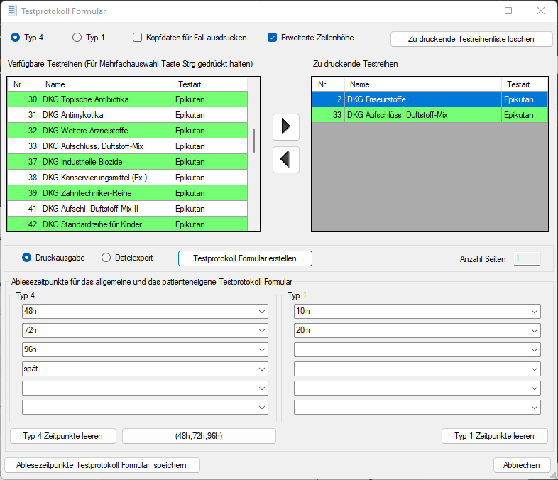 •Entwerfen und verwalten Sie Ihre eigenen Testprotokoll Formulare und binden Sie optional Ablesezeitpunkte ein. Beliebige Testreihen derselben Testart können kombiniert werden; der Screenshot zeigt 2 DKG Testreihen mit der Testmethode Epikutan.