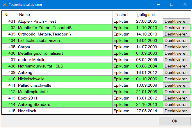 Klinik-Testreihen können auf Grund von historischen Ausdrucken lediglich deaktiviert aber nicht gelöscht werden. Deaktivierte Testreihen stehen somit nicht mehr bei der Testreihenplanung- bzw. auswahl in der Testreihenliste zur Verfügung.