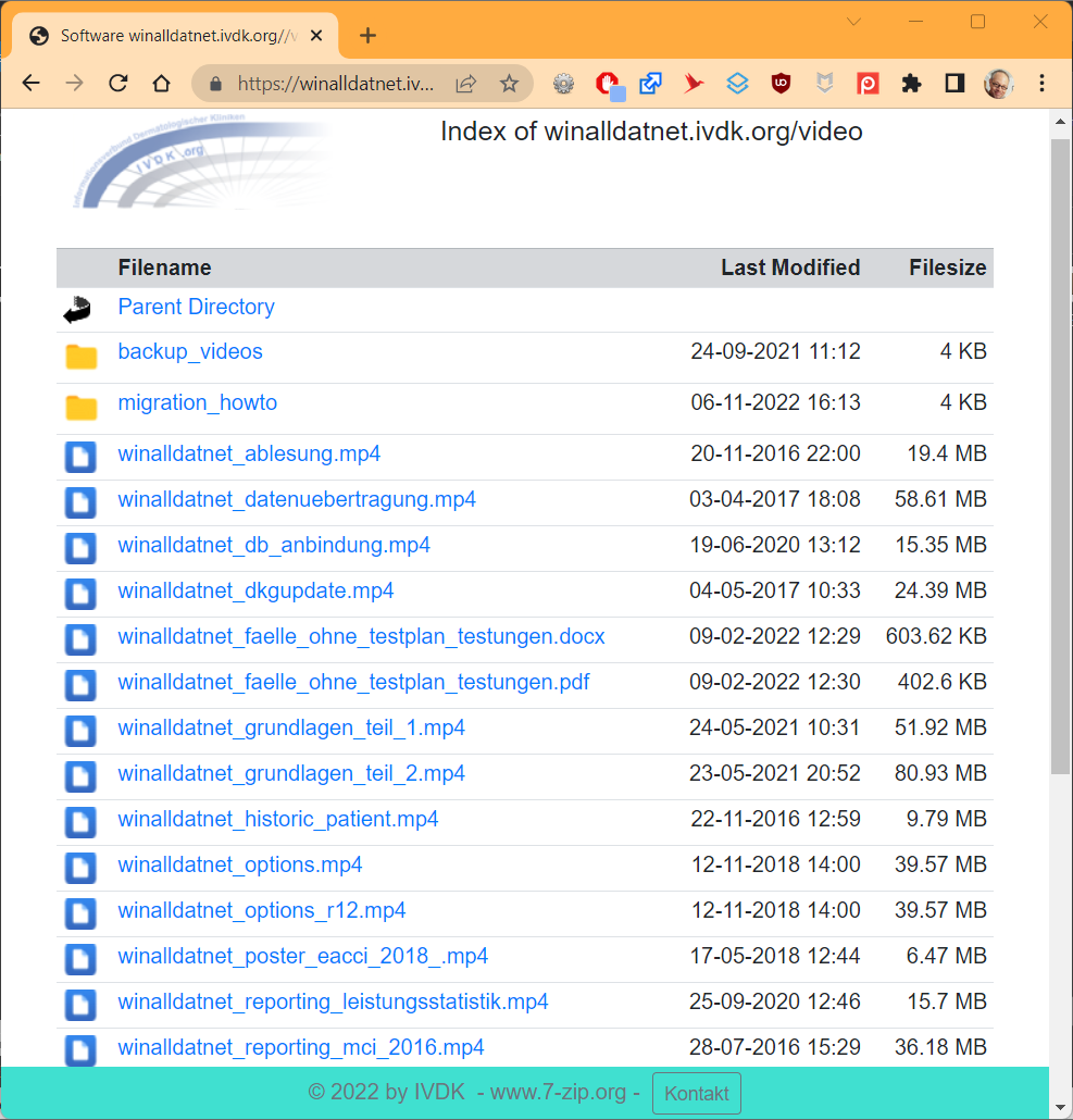 Videos (i.e. Screencasts) zur WinAlldat Net Software unterstützen Sie bei ihrer Arbeit, in dem wichtige und teilweise komplexe Arbeitschritte erläutert und visuell demonstriert werden. Insbesondere das Anlegen neuer Testreihen, die Berufssuche, das DKG Testreihenupdate und die Datenübertragung an den IVDK sind hier zu nennen. Verfügbare Videotutorials sind auf der Winalldat Net Video Webseite:https:// winalldatnet.ivdk.org/video aufgelistet und benötigen einen Internetzugang, Kopfhörer/Boxen sowie einen MP4 Videoplayer wie z.B. den frei verfügbaren Videolan VLC Player. Die Sammlung der WinAlldat Net Screencasts wird fortlaufend ergänzt.